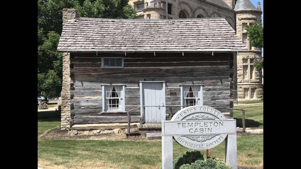 The Templeton cabin (originally 10 logs high) that now sits on the Courthouse Square, was built in 1805 by John Templeton. The original site of the cabin was just north of where Hanna’s creek flows into the Whitewater. In 1937 the cabin was moved to the Jail yard on Union Street, then moved again in 1980 to the Courthouse lawn.